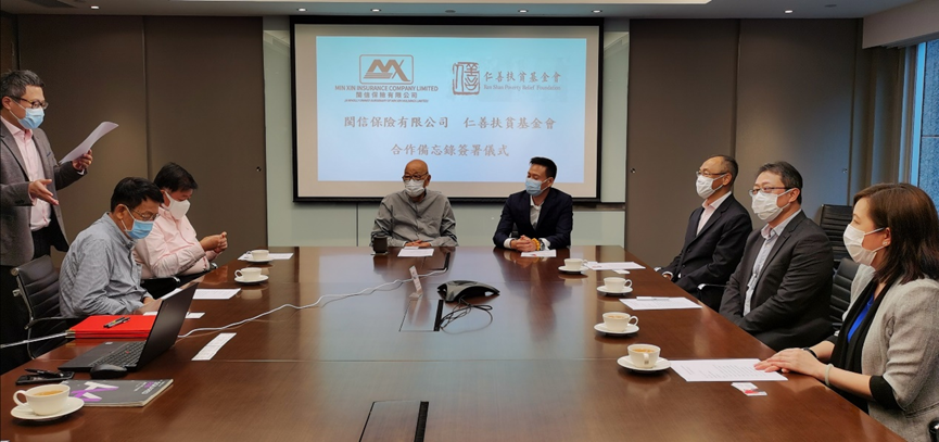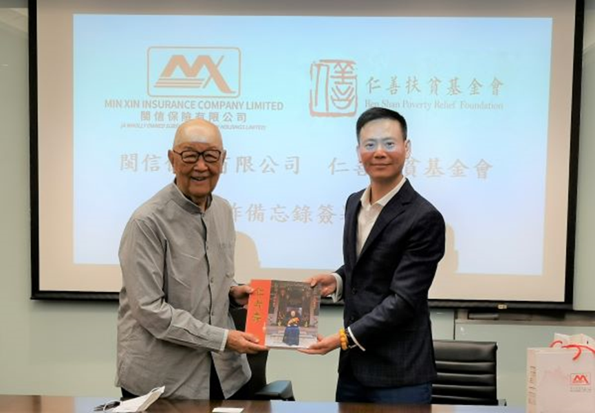 2020年9月9日,閩信保險有限公司與仁善扶貧基金會舉行合作備忘錄簽字儀式,由閩信保險代理行政總監吳徐斌和仁善扶貧基金會會長陳守仁博士簽署合作備忘錄。此次簽約後,閩信保險與仁善福來社將攜手合作,推出「仁善福來會員保險優惠計劃」,為各閩籍社團及會員鄉親提供家居、旅遊、人身意外等綜合保險優質服務。